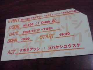 三宮にあるライブハウス“16bit”に行ってきました。 “カフェビット”はクボタくんが毎月主催しているライブイベントです。 クボタくんはインストのギタリスト! ほんと良かった!! とっても素敵な音色を奏でていて、 音がしみ入るように私の体中を巡ってゆく。 すごく好きな演奏でした。 クボタアツシHP http://www.freepe.jp/i.cgi?atsushi0 私の位置がスピーカーから近かったせいか、 音のつぶが少し、とんがったように聴こえたなぁ。 (ギターのシールドを変えてからちょっとギラッとした音になったみたいですが) もうちょっと大きなところでも聴いてみたいと思いました(o^-^o) ライブハウス自体はクリアーな音作りで良いところでした。 でもトイレが無いのっっ(TmT)ウゥゥ・・・ ライブハウスで写真を撮るのを忘れたので、、、 (いっつもなにかを忘れてしまいますけど、、、) このライブに誘ってくれた、 ライブハウス“Blanton”スタッフのよしえちゃんに、 「チケットの写真をメールしてっっ」 とお願いしました。 サンキュー♪(*'-^)-☆ 左 クボタアツシくん 右 コバヤシユウスケくん コバヤシくんも良かったですよ。 かっこいい曲でした、私の好きなメロディーライン。 そそ、 オマケの写真も送ってくれました(笑) そうかぁ、コスモとして“Blanton”でライブをしたのは、 2005年ですか、けっこう前の事なんだなぁ。 来年の春以降になると思いますが(;´Д`A ``` また“Blanton”でライブをしたいなぁと思っています。 ソロでもバンドでもね。 ブラントンHP http://blanton-music.com 今日もブログを読んでくれてありがとう。 |